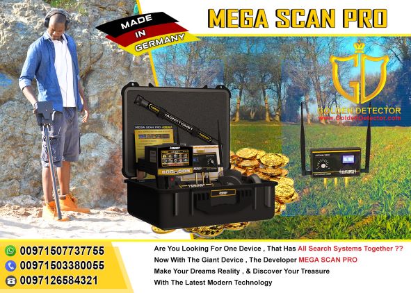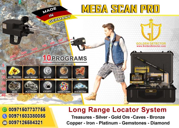 • Mega Scan Pro by Mega Locators This professional device can search in 3 systems. The long-range sensor system, ionic scan system, and Magnetometer system. Up to 2000 meters in long-range and 40 meters depths underground. With 5 years warranty and made in Germany. Can search in 10 programs: Gold treasure, gold nuggets, silver, copper, bronze, iron, platinum, diamond, gemstones, caves and spaces. You can visit my showroom in Abu Dhabi in the tourist club area. Free shipping worldwide Free training For more information please contact me on WhatsApp +971507737755 or +971503380055 or info@GoldenDetector.com