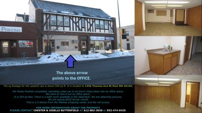 - The sq footage for the upstairs apt is about 500 sq ft. It is located at 1336 Thomas Ave St Paul MN 55104. We finally finished completely rebuilding what use to be Dino's Pizza place into an office space. We want to rent it out as office space. It is 500 sq feet. There is a bath room available in the basement. We are attaching pictures. We are asking $650.00 per month. That is 2.5 blocks from the Midway shopping center and lite rail access. FOR MORE INFORMATION ABOUT THE PROPERTY PLEASE CONTACT CHESTER & GISELLE BUTTERFIELD AT 612-802-3039 or 952-474-0425.