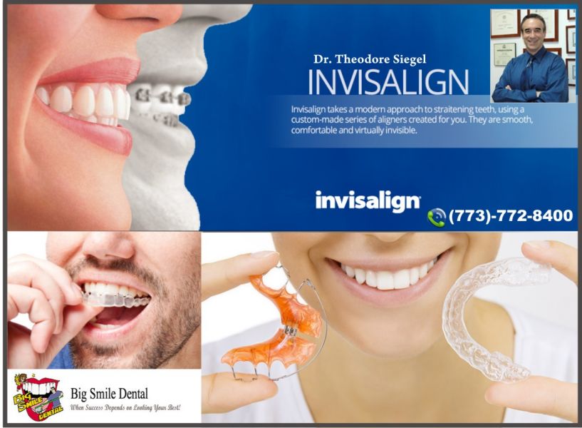 - Brilliant Invisalign procedures to transform your Smile with Dentist Dr. Theodore M. Siegel at Big Smile Dental Chicago in Chicago, IL. Call 773-772-8400 Now! ------------------------ Contact Us ------------------------ Big Smile Dental, 2833 N Milwaukee Ave, Chicago, IL 60618 TP - 773-772-8400 ------------------------ Office Hours ------------------------ Monday: 9:30 AM - 6:00 PM Tuesday: 9:30 AM - 6:00 PM Wednesday: 9:30 AM - 6:00 PM Thursday: 9:30 AM - 4:00 PM Friday: 9:00 AM - 2:00 PM Saturday: 9:30 AM - 6:00 PM ------------------------ Website - http://www.bigsmiledental.com/invisalign/index.html Facebook - http://www.facebook.com/bigsmiledental Twitter - https://twitter.com/dentistchicago Google+ - https://plus.google.com/+BigSmileDentalChicago/about?gl=lk&hl=en