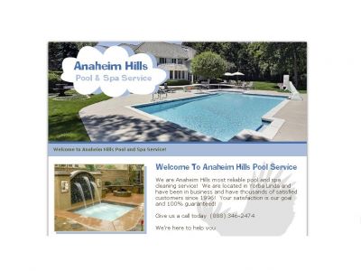 - Welcome To Anaheim Hills Pool Service We are Anaheim Hills most reliable pool and spa cleaning service! We are located in Yorba Linda and have been in business and have thousands of satisfied customers since 1996! Your satisfaction is our goal and 100% guaranteed! Our weekly pool cleaning service is performed by the same person each week. We net, tile brush, clean your tiles, vacuum pool and spa each visit, brush steps and walls as needed, empty skimmer and pump baskets, check and adjust chemicals then leave a signed door tag on your front door. So you know we were there. All this from $80.00 per month for an average size pool. There’s no contracts to sign, cancel anytime. No hidden fees and no gimmicks! We also offer pool and spa repairs by one of our two full time repair technicians with over 30 years combined experience. Give us a call today (888) 346-2474 We’re here to help you Our Business hours are Monday- Friday 8am to 4:30pm Saturdays- by appointment Sundays- Closed