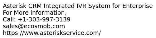 - Are you looking for long-term Investments in software that handle all of office work data and clients database in a software easily? Asterisk CRM Integrated IVR (Interactive Voice Response) System perfect for Office CRM Software with additional features and functionality. It handles all data in single software and you can easily track each data separately without complexity. Features: -IVR Script -Real-Time Data -VoiceXML Support -Call Control XML Processor -DTMF Input Support -Voice-Tone Input Support For More information, Call: +1-303-997-3139 sales@ecosmob.com https://www.asteriskservice.com/