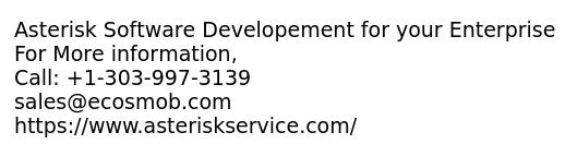 - Asterisk is a powerful open source language using that we can build simple level to advanced level features in our software according to our requirements. Asterisk Software Development Provide such Custom development according to clients requirements.Asterisk Service Provide you quality service with satisfactory work. Services: -System -Software -Application -Module -Customization in Existing System -Dialplan Programming -AGI Scripting For More information, Call: +1-303-997-3139 sales@ecosmob.com https://www.asteriskservice.com/
