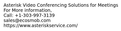 - Face to face communication create trust in the business and make your business to the high level in the market. Live conferencing impact on your business production and trust factor. Asterisk Video Conferencing Solution Provide High-Quality audio and video that used to make strong bond in the business.In additional Latest features and functionality make users experienced rich. Features: -User Friendly -Scalable & Robust -Simplified Conference Creation -No Additional Hardware Required -Ease of Customization -Reliability -Recording For More information, Call: +1-303-997-3139 sales@ecosmob.com https://www.asteriskservice.com/