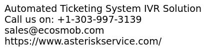 - Worry about conventional ticket booking system...? Asterisk introduced Automated Ticketing System IVR Solution that book tickets through your phone. Automated Ticketing System IVR Solution free your resource that utilized more effectively, but also improve customer satisfaction.With Advanced and rich features we provide best Automated ticket IVR Solution to the customer. Features: -Configurable IVR Prompts -Configurable IVR panel -Voice recognition -Payment gateway integration -CDRs and Logs -Report For More information, sales@ecosmob.com +1-303-997-3139 https://www.asteriskservice.com/