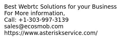 - Asterisk WebRTC solution gives boost your business and satisfied your client's needs.Best Conferencing Lead your business to a new level and create the best reputation in the market.Asterisk WebRTC conferencing Solution Gives best Audio conferencing, Video conferencing and data sharing tool with Live chatting solution. In Addition, WebRTC Also Provide Advanced feature and functionality. Features: -Session Rehydration -Audio & Video Calling -Session Mobility -Screen Sharing -Ease Network Change -Multi Tenancy -User Authentication For More information, Call: +1-303-997-3139 sales@ecosmob.com https://www.asteriskservice.com/