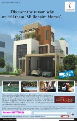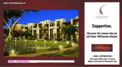 - Concorde Cupertino: A Millionaire's Villa BDA Approved- ISO CERTIFIED 9001:2008 Consists of 180 independent villas of splendid designs and boast of carefully crafted floor plans ranging between 1850 and 3350sqft. It will revolutionize the concept of modern living in the form of a self-contained layout Every inch of this extensive layout will complement your lifestyle and each day at Concorde Cupertino will be a spellbinding experience With everything from housing to hospital, school, shopping malls and restaurants within a radius of 2 kms, the project makes you enjoy the refinements of a luxurious lifestyle with the comforts of living in the mid of the IT hubs. Opp to Wipro Technologies, Infosys, Siemens and HP are walkable distance, 3 and 5 Star Hotels in 1 km range from Our Project: Crown Plaza, Lemon Tree, Svenska, Radha Regent, and Lords Plaza. Nearest Schools: Treamis World School, Samhita Academy, Ebenezer International School, Brookfield, Christ Academy, & St. Xavier’s.