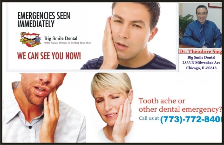 - At Big Smile Dental Chicago in Chicago, IL you are offered top of the class Emergency Dental Care. Call Dr. Theodore M. Siegel on 773-772-8400 for treatment ------------------------ Contact Us ------------------------ Big Smile Dental, 2833 N Milwaukee Ave, Chicago, IL 60618 TP - 773-772-8400 ------------------------ Office Hours ------------------------ Monday: 9:30 AM - 6:00 PM Tuesday: 9:30 AM - 6:00 PM Wednesday: 9:30 AM - 6:00 PM Thursday: 9:30 AM - 4:00 PM Friday: 9:00 AM - 2:00 PM Saturday: 9:30 AM - 6:00 PM ------------------------ Website - http://www.bigsmiledental.com/emergency-dental-care/index.html Facebook - http://www.facebook.com/bigsmiledental Twitter - https://twitter.com/dentistchicago Google+ - https://plus.google.com/+BigSmileDentalChicago/about?gl=lk&hl=en