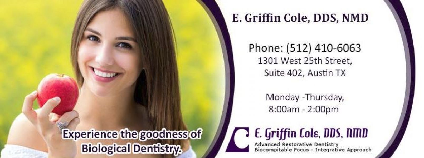 • Biological dentistry combined with comprehensive general dental services is the uniqueness of E Griffin Cole DDS NMD office in Austin, TX. Call 512-410-6063 now. Visit this site for more informaiton - http://articles.org/biological-dentistry-in-austin-tx/