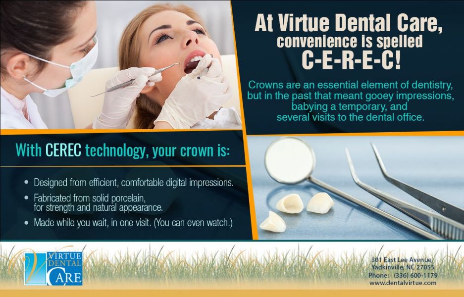 - CEREC Porcelain Crowns Yadkinville - Call Virtue Dental Care of Yadkinville to learn more about how we use inlays, onlays, crowns, or other porcelain restorations to improve smiles in one visit. Website: www.dentalvirtue.com/cerec-crowns-and-onlays/index.html Contact us: (336) 600-1179 Office Hours: Monday 8:30am - 5:00pm Tuesday 8:30am - 5:00pm Wednesday 8:30am - 5:00pm Thursday 8:30am - 4:00pm Get Social with us: https://www.facebook.com/DentalVirtue https://twitter.com/DentalVirtue https://plus.google.com/109927162143938201947