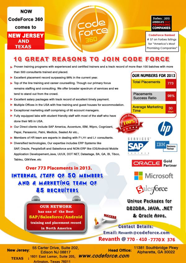 - CODEFORCE 360 is a growing consulting and technology services company focused on leveraging technology to drive business value. Named one of America’s Most Promising Companies by Forbes Magazine, CODEFORCE 360 leverages more than thirty different technologies in the mobile, cloud, ERP and BI space to deliver solutions to more than 150 clients. Our business partners include SAP, Salesforce, HP, IBM, Oracle and Microsoft. Our Cloud Technology practice operates under the Accelerize 360 brand and can be found at www.accelerize360.com We are currently hiring for Java/ios/Android Developer positions for our fast growing technology practice on skill sets mentioned below. We also offer Intensive skill enhancement program/ training programs for selected employees in one of the latest technologies before being deployed on projects. Candidates must possess: • Experience in programming languages Java, Java script, and understanding