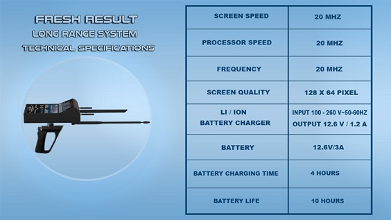- Gold Master is pleased to offer you the world's latest technology for underground water detection-the FRESH RESULT 2-System Device. It is perfect for farmers, agricultural land investors, researchers and explorers looking for a good source of ground waters. 2 Systems of Fresh Result device are: 1. Long Range System-this high resolution system detects water at a distance of up to 2000 meters front range and depth of 1200m. The user can even stand up on the exact location of the target with the ability to determine its depth. 2. Geophysical System-scans all layers of the ground up to a depth of 1,200 meters showing the result on the LCD screen of the device and determines the type of water being detected(fresh, salty or natural) and its density. It has automatic ground balancing system to adjust with the type of soil being scanned giving accurate details of the target. This device can be used in all types of terrain. Watch user video at: https://www.youtube.com/watch?v=vCp-Sf4zIoo