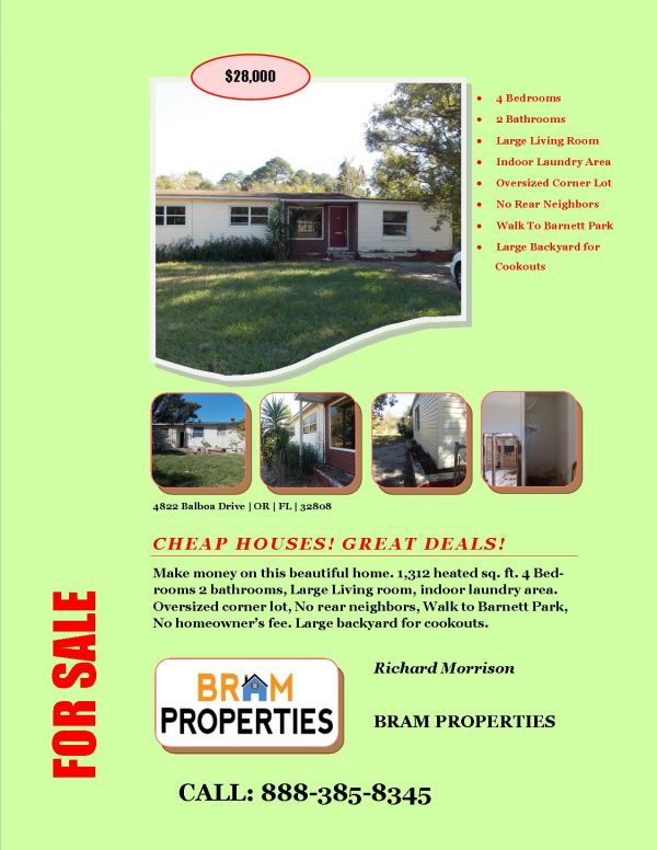 - $28,000 58% ARV ARV $ 65 to $ 75,000 Needs $ 8 --$ 10,000 in Rehab Make money on this Beautiful Home 1,312 Heated Sq Feet 4 Bedroom 2 Bath Large Living Room Indoor Laundry Area Oversized Corner Lot No Rear Neighbors No Homeowner’s Fees Walk to Barnett Park Large Backyard for Cook Outs CALL:888-385-8345
