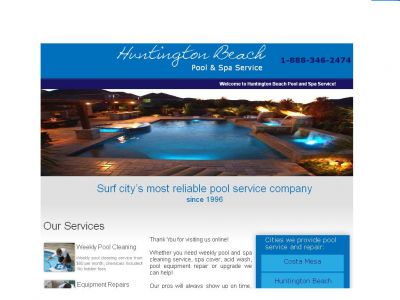 - We have been helping Orange County Pool and Spa owners enjoy their pools since 1996! When you do business with us your satisfaction is our goal. We pride ourselves on our professionalism, consistency and reliability. Our weekly pool service includes: the same person at your home once per week. We net, tile brush, clean your tiles, vacuum pool and spa each visit, brush steps and walls as needed, check and adjust chemicals, leave a signed door tag on your front door so you know we were there. Our service starts at $80 per month for an average size pool. We are a full service pool and spa maintenance and pool equipment repair company, we also work on hot tubs, sell spa covers, deck-o-seal replacement, equipment troubleshooting and repair by one of our qualified service repair technicians with over 30 years combined experience. Give us a call, we look forward to earning your business and trust. 888-346-2474 Visit our website at www.huntingtonbeachpoolspa.com or email us at info@huntingtonbeachpoolspa.com