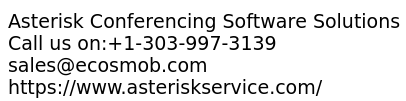 - International business is Continue growing and People Make Their Meeting and presentation with conferencing Software solutions.Asterisk Conferencing Software Solutions Gives you more advanced and rich features to make easy conferencing. Asterisk conferencing provide you High quality video and audio that Make Your conferencing More valuable. Features: -User Friendly -Scalable & Robust -Simplified Conference Creation -No Additional Hardware Required -Reliability -Recording For More information, +1-303-997-3139 sales@ecosmob.com https://www.asteriskservice.com