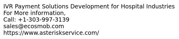 - Payment method through IVR can easily be done in Hospital Industries through Asterisk IVR Payment Solution that gives more security and reliability. You can pay the bill at any time from anywhere through simple call and make the payment that gives full secure transaction. Asteriskservice provides customized IVR Payment solution according to your requirement. Features: -No additional Plugins -Scalable & Robust -No additional hardware required -Ease of Customization -Reliable -Recording For More information, Call: +1-303-997-3139 sales@ecosmob.com https://www.asteriskservice.com/