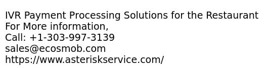 - Make your Customer happy by providing them best Payment Experience.A satisfied customer can promote your business than any other platform. Interactive Voice Response (IVR) make your business experienced rich by providing advanced features with Secure payment. Features: -Multiple data integration support -Multiple Payment method -Credit Card -Easily integrated with any device -Custom Call transfer logic For More information, Call: +1-303-997-3139 sales@ecosmob.com https://www.asteriskservice.com/
