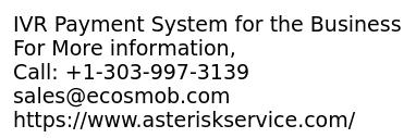- Today customers Prefer cashless Transaction for the Payment.Use IVR Payment System for the transaction in your business and make your customers happy and save their time. IVR payment System provides multiple functionality and features. IVR Payment is Secure for the transaction in the business. Features: -Multiple data integration support -Multiple Payment methods -Credit Card -Easily integrated with any device -Custom Call transfer logic For More information, Call: +1-303-997-3139 sales@ecosmob.com https://www.asteriskservice.com/