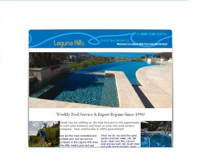 - Welcome to Laguna Hills Pool and Spa Service Thank You for visiting us. We look forward to the opportunity to earn your business and trust as your new pool service company. Your satisfaction is 100% guaranteed! We are the most consistent and reliable pool and spa service company in the Laguna Hills area. We offer weekly pool and spa service from only $80 per month, chemicals included, no gimmicks or hidden fees. What we do: we send the same person once per week, net, tile brush, clean your tiles, vacuum pool and spa each visit, brush steps and walls, empty baskets, check and adjust chemicals, leave a door tag every visit so you know we came. Please give us a call at 888-346-2474 Visit our website at www.lagunahillspoolspa.com Or email us at info@lagunahillspoolspa.com
