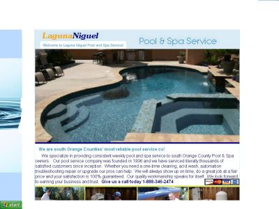 - We are south Orange Counties' most reliable pool service co ! We specialize in providing consistent weekly pool and spa service to south Orange County Pool & Spa owners. Our pool service company was founded in 1996 and we have serviced literally thousands of satisfied customers since inception. Whether you need a one-time cleaning, acid wash, automation troubleshooting repair or upgrade our pros can help. We will always show up on time, do a great job at a fair price and your satisfaction is 100% guaranteed. Our quality workmanship speaks for itself. We look forward to earning your business and trust. Give us a call today 1-888-296-2879 Office Hours are Mon- Fri 8am to 4:30pm Sat- by appointment Sun- closed Our website is www.lagunaniguelpoolspa.com You may also email us at info@lagunaniguelpoolspa.com You can find us on facebook / see below http://www.facebook.com/pages/Laguna-Pool-Spa-Service-and-Repair-888-296-2879/370373076321702?sk=wall