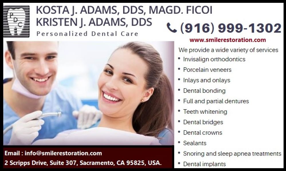 - Comprehensive and Professional Dental Care by Experienced Dentist Kosta J. Adams at Sacramento, CA. Call 916-999-1302 today!. Tel : (916) 999-1302 Visit : http://www.smilerestoration.com/ Office Hours Mon, Sat & Sundays available for emergencies Tue 8.45am to 5.30pm - Lunch 1pm to 2pm Wed 8.45am to 5.30pm - Lunch 1pm to 2pm Thu 8.45am to 5.30pm - Lunch 1pm to 2pm Fri 8.45am to 5.30pm - Lunch 1pm to 2pm Kosta J. Adams, DDS, MAGD, FICOI / Kristen J. Adams, DDS 2 Scripps Drive, Suite 307, Sacramento, CA 95825 Like Us: https://www.facebook.com/Kosta-J-Adams-DDS-MAGD-Kristen-J-Adams-DDS-167617220151/ Follow us: https://twitter.com/drkostaadams