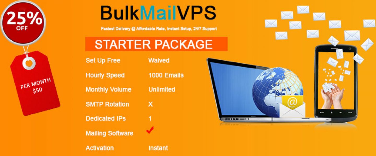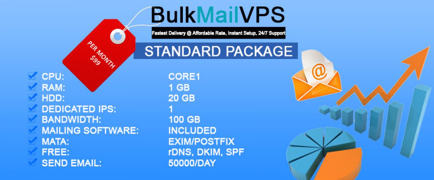 - To start sending emails with BULK MAIL VPS you don’t need to do anything. We will setup server for you with MTA, LAMP, web based Mailing Software and you will get it ready to go. You can also use our servers with your own software if you have any. Our direct mail services provide an outstanding way for your business to proficiently communicate with your customer and email subscribers. The main aim of our brand is to help your business in reaching the maximum number of prospective customers in quickest possible time and in minimum price. Standard $99/month • CPU Core: 1 • RAM: 1 GB • HDD: 20 GB • Bandwidth: 100 GB • Dedicated IPs: 1 • Mailing Software: Included • MTA: Exim/Postfix • Free: rDNS, DKIM, SPF • Send Emails: 50000/day Order Now http://www.bulkmailvps.com