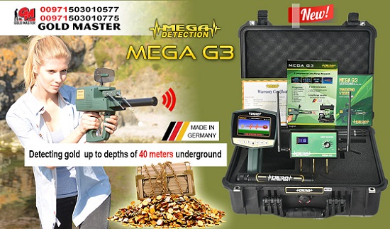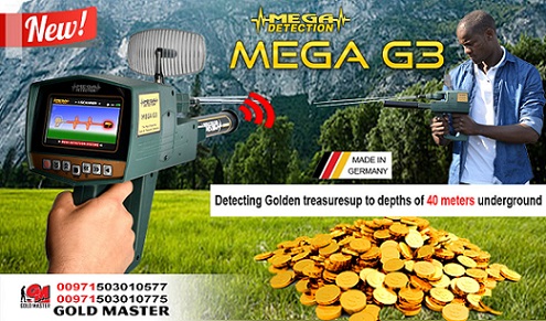 - MEGA G3 is the latest model and world's best metal detector proven and tested for its reliability in metal & gemstones detecting. MEGA G3 has LCD high resolution screen and long lasting battery that can be used up to 20 hrs and a laser system to easily determine the direction of the target set by the device from a distant point. It has an ideal design combining accuracy and ease of use which can easily be learned by first time users. Search Systems: 1. Long Range Locator-detects target up to 2,000 meters front range and 40 meters deep underground with the ability to explore all types of terrain including mountainous, muddy and even rocky land. 2. Ionic Scanner System-detect targets, especially metals, that has been buried for a long period of time. The longer an object is buried, the higher its ionic stregnth, therefore easier to detect. Program Options are: 1. Gold Treasures 2. Gold Nuggets 3. Diamond 4. Gemstones 5. Copper 6. Cavity 7. Silver 8. Bronze info@gold-master.com