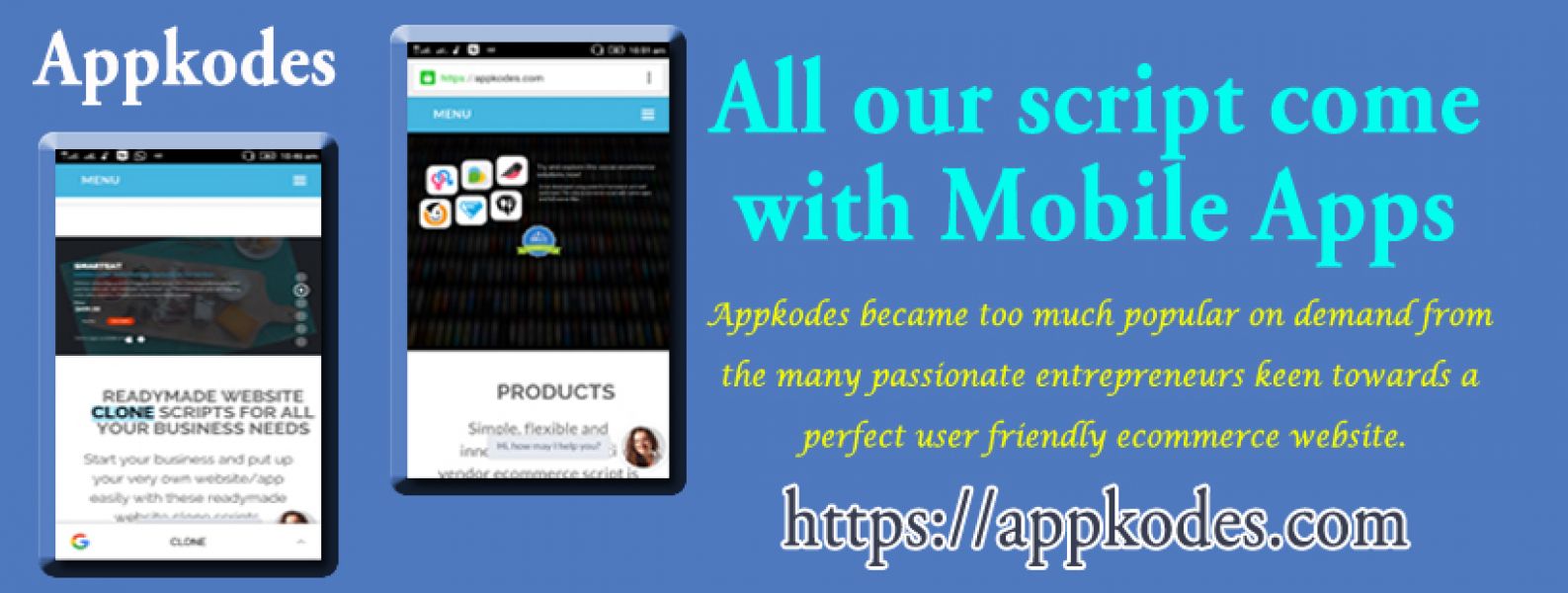 - Looking for the Best php clone scripts provider, visit AppKodes products to own your online maketplace and ecommerce development. Simple, flexible and innovative! Our multi vendor ecommerce script is designed to make it easy for people to become entrepreneurs.Advanced and powerful technologies were chosen by us for your Advanced online classifieds website which will be long lasting for years . We carefully chosed the best & trending technolgies for your mCommerce business needs which will be long lasting for years. sales@hitasoft.com https://appkodes.com/products/