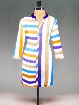 - A gorgeous white color georgette kurta with multicolor stripes that'll make you look your glamorous best! Designed with stripes, it features a collar neck design that gives it a regal touch! Luxuriant and tasteful,it's an ideal pick to wear to winter weddings!Accent your look with kundan jhumkaas. This type of Kurtas will be available in Unnati silks. Unnati silks has widest varieties of ranges. Different types of models we can find in Unnati silks like Casual wear, Party wear, Weading wear, Traditional wear. In Unnati we can find different varieties of sarees and dress materials, tops, dupattas also. Womens are usually interested on unique colour and models of wearing. Each and every type of models you can find in Unnati silks. At Unnati silks online products are very reasonable prices. Unnati silks dispatch the order within 24 hours.