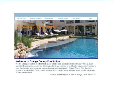 - Welcome to Orange County Pool and Spa Service We are Orange Counties’ most consistent and reliable pool and spa service company. We handle all aspects of swimming pool service: Weekly pool and spa cleaning to pool heater repairs, acid washing to pool tile cleaning, spa covers and new pool design and installations. Orange County Pool Service is located in Mission Viejo, CA and services all cities in Orange County. We look forward to the opportunity to earn your business. Give us a call today, we’re here to help you. 888-296-0478 Business Hours: Mon- Fri 8am to 4:30pm Saturdays- by appointment. Sundays- Closed Visit our website at www.orangecountypool.com or email us at info@orangecountypool.com
