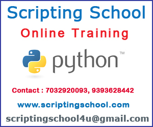 - SCRIPTING SCHOOL is one of the leading Training Company involved in providing Python Online Training. Our Trainers are expert in providing Online Training with real time experience. Two Demo classes are at free of cost. 1. Project Oriented Training 2. Real time scenarios with examples 3. Tips & assistance for resume preparation 4. Guidance for certification 5. Interview assistance About Faculty: Excellent trainers who have good orientation in online training with real time experience. For more details please contact 7032920093, 9393628442. Mail id: scriptingschool4u@gmail.com For detailed course content visit http://www.scriptingschool.com/python-online-training.php
