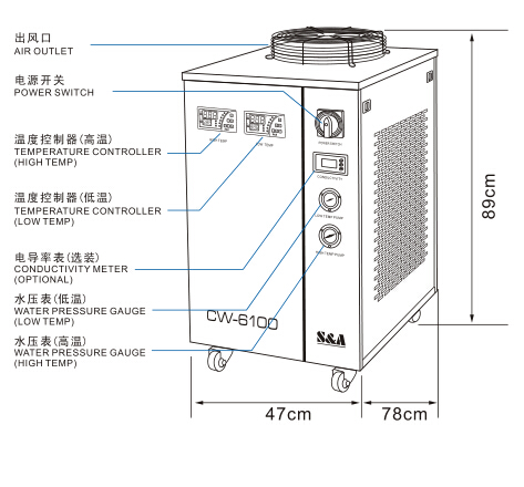 - S&A CW-6100AT dual temperature and dual pump series is high-precision compression refrigeration water chiller,with intelligent temperature control,completed configuration,perfect protection and alarm system. S&A dual pump chiller CW-6100AT is able to cool the fiber laser head and dc power at the same time, multiple use for saving cost, space and manual move, quiteconvenient for the user. CW-6100AT features: 1. 4200W cooling capacity; optional environmental refrigerant; 2. ±0.5℃ precisely temperature control; 3. The intelligent temperature controller has 2 control modes, applicable to different applied occasions; with various setting and display functions; 4. Dual temperature and dual pump to satisfy different needs of fiber laser device and the lens; 5. With Ion adsorption filtrating and test functions conform to fiber laser device operating requirements; 6. Multiple alarm functions: compressor time-delay protection, compressor overcurrent protection, water flow alarm