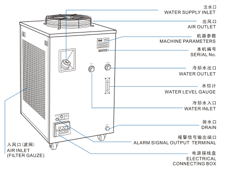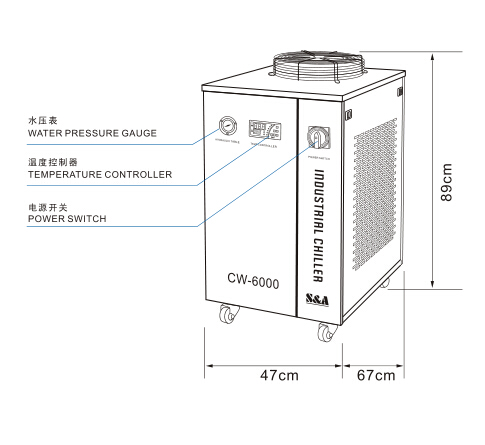 - A customer , from Canada , purchases water chiller CW-6000 to cool spot welding machine. S&A water chiller CW-6000 has 3000W cooling capacity with ±0.5℃ stability, it is fit for Spot Welding application.It has 2 temperature control modes as constant temperature and intelligent temperature control. Under intelligent mode, the water temperature is adjusted according to ambient temperature. Multiple alarm functions: compressor time-delay protection, compressor overcurrent protection, water flow alarm and over high / low temperature alarm. S&A chillers have passed ISO, CE,RoHS and REACH approvals and the warranty is 2 years. Water chiller parameter: Voltage:110V-220V; Frequency: 50/60Hz; Refrigerant: R-22 / R-410a Pump power: 0.05KW/0.1KW/0.37~0.75KW; Tank capacity:15L Max. lift:10M/25M/28~53M; Max. flow: 13L/min- 70L/min N.W: 60Kgs; G.W: 70Kgs; Dimension : 67 X 47 X 89 cm (L X W X H); Packing dimension: 74 X 60 X 109 cm(L X W X H)