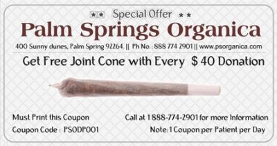 - Welcome to Palm Springs Organica. We provide only the highest quality medicine to our patients and serve the entire Palm Springs. Our medical marijuana dispensaries are quickly becoming one of the fastest growing and largest dispensaries in the Palm Springs. Our patients come from every city; Palm Desert, La Quinta, Rancho Mirage, Indio and others. Please take a look at our menu and come on by to experience the best dispensary and the best medicine in the Palm Springs. Palm Springs Organica offers the free medical marijuana delivery service in nearest city such as Palm Desert, La Quinta, Rancho Mirage, Indio, etc. Now special offers running in Palm Springs Organica, You can get free joint cone with every $ 40 Donation. To get this offer you must print the bellow coupon. For more information regarding coupon and PS Organica you can call us at our service number 888-774-2901 or you can visit at our website http://www.thcsupport.com.