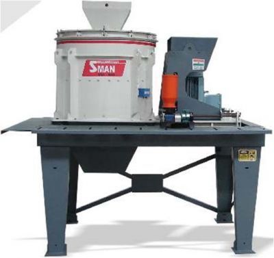 - SMAN Vertical Shaft Impactor (VSI Crusher) • Ready to use structure. Quick Installation, Immediate operation ( wheel mounted mobile option is also available ) • Variable production capacity for tertiary stage material • Rock on technology ensures minimum operating costs along with least wear & tear. • Shape of output material is cubical & exellent for concreting • Low investment. Low downtime for replacement of parts & consumables. • Easy retrofit option for conversion from rock on rock to rock on metal. HOW IT WORKS The Machine Mechanism is simplified. The material to be crushed is dropped on top chute & goes through material tube on to center of closed rotor. Material from rotor gets thrown with high centrifugal force as the rotor rotates on high rpm. when this material hits inside the Rock chamber assembly it gets shaped due to impact & depending on inertia of the material cubical shaped products falls freely due to gravity through the bottom chute