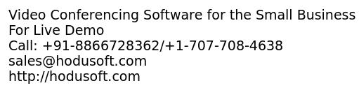 - In past, many Industries and small and medium-size business had struggled for video conferencing due to low internet connectivity, a high cost of conferencing and costly equipment. But now technology reach that point that you can easily make High-quality video conferencing with less amount. With latest features and functionality you can easily create conferencing at any place to any destination. Hodusoft provides high-quality Video Conferencing Software with robust functionality that makes user experienced better. Features: -No plugin required -Rollcall Features -Mail Notification -Live Conferencing View -Recording -Music on hold For Live Demo Call: +91-8866728362/+1-707-708-4638 sales@hodusoft.com http://hodusoft.com