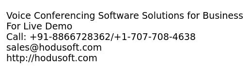 - By choosing Best Video Conferencing Software for your business, you can save huge amount according to research. Many businesses involving employees from all over the world, Video Conferencing Software allows them to connect with each other and they easily collaborate with each other and discuss the business meeting. So indirectly that increase your business productivity. Hodusoft Video Conferencing Software creates smooth conferencing without any external interface. Features: -No plugin required -Rollcall Features -Mail Notification -Live Conferencing View -Recording -Music on hold For Live Demo Call: +91-8866728362/+1-707-708-4638 sales@hodusoft.com http://hodusoft.com