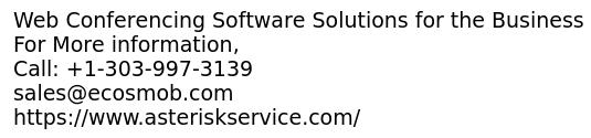 - Are you ready to establish your business network to international level? Make your business conference better using Asterisk Web Conferencing Software Solution. That provides you high-quality audio and video with advanced functionality. Scalable and Robust Perfomance can save your time and money. Features: -User Friendly -No additional Plugins -Scalable & Robust -Ease of Customization -Reliability -Recording For More information, Call: +1-303-997-3139 sales@ecosmob.com https://www.asteriskservice.com/