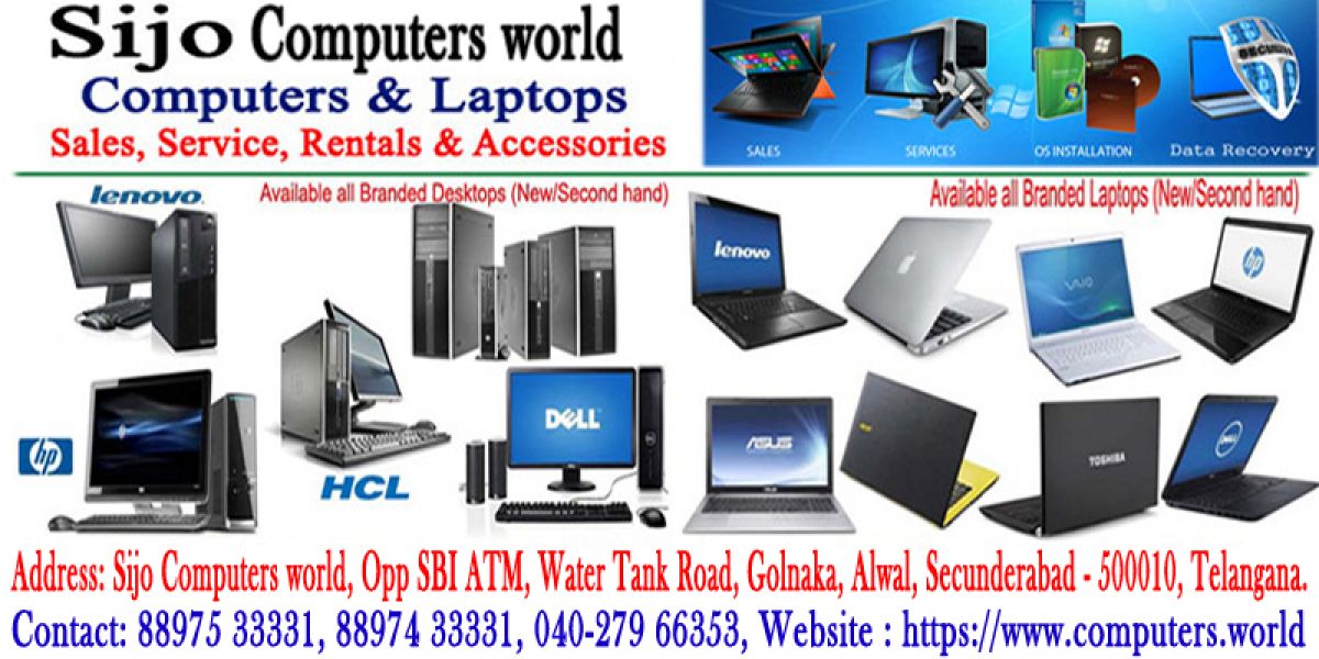 - Sijo Computers world - Computers & Laptops Distributors, Wholesalers and Retailers - Available All Branded Desktop Computers and laptops sales in very low price, Good condition, 12 month service warranty. in Alwal, Hyderabad. Sijo Computers world - Computers & Laptops Distributors, Wholesalers and Retailers - Branded Destop Computers, Laptops and Accessories : Sales, Services & Rentals. Reasonable Rates & 100% Guarantee.HP/Compaq, Lenovo, Apple, Acer, Toshiba, Dell, Sony, Asus, ect.. We Deal All Major Brands Computers Repair any Brand, any Problem & AMC ( Annual Maintenance Contract ) Used Branded Desktops start from - 6,000/-, Used laptops start from - 8,000/- in Alwal, Hyderabad. Hurry Up Limited Time Offer. Contact: 88975 33331, 88974 33331, 040-279 66353 Email id : sijocomputerworld@gmail.com Email id : sales@computers.world web site : https://www.computers.world Address: Sijo Computers world, Opp SBI ATM, Water Tank Road, Golnaka, Alwal, Secunderabad-500010, Telangana.